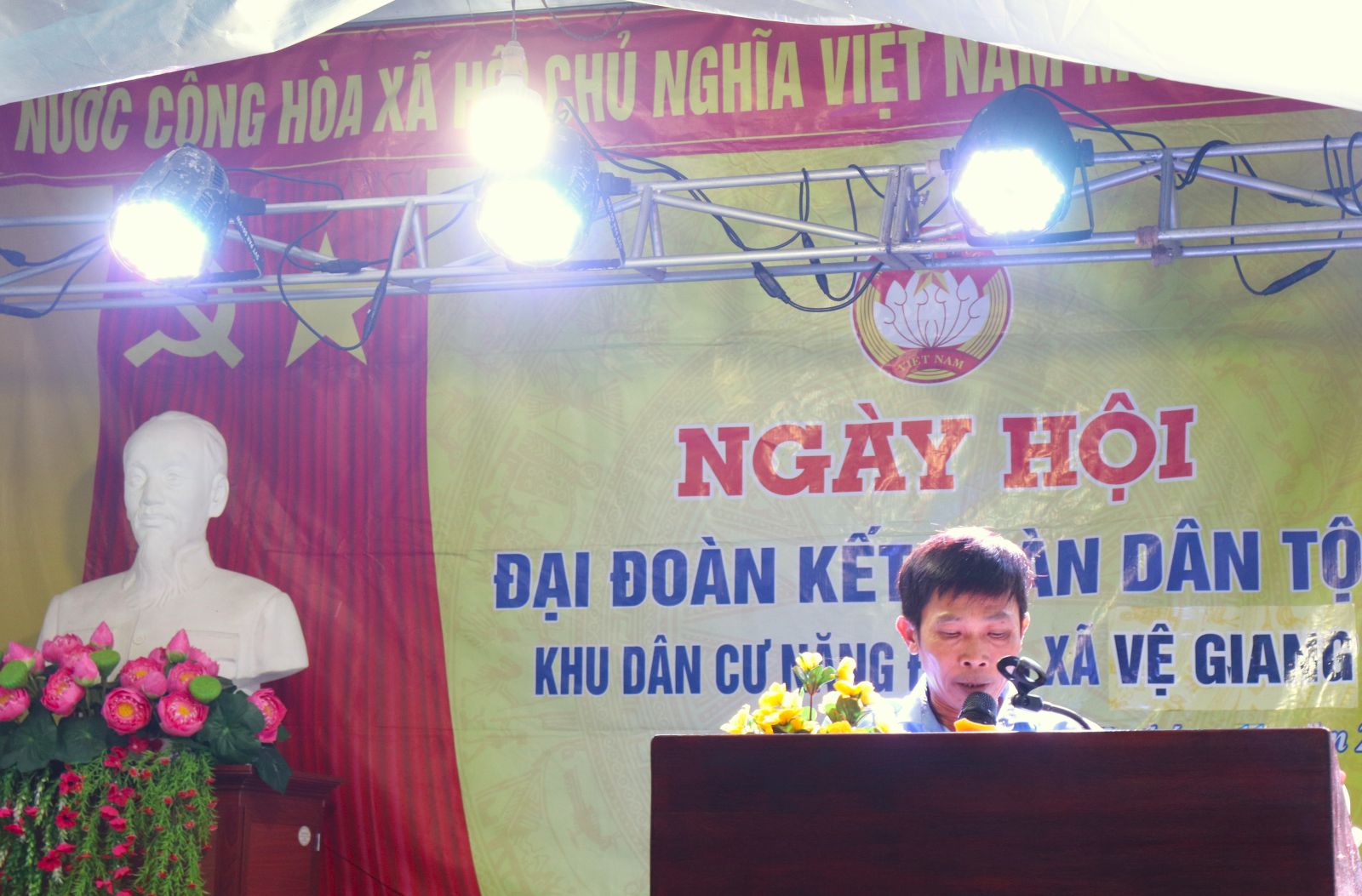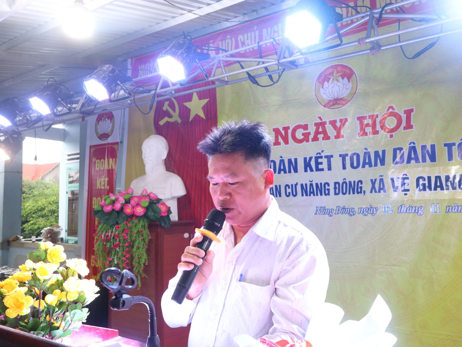 🌺 Phát biểu tại Ngày hội, đồng chí Võ Đình Tám – Ủy viên Ban Thường vụ Đảng ủy, Chủ tịch Ủy ban MTTQ Việt Nam xã Vệ Giang biểu dương những kết quả mà cán bộ và nhân dân thôn Năng Đông đạt được trong thời gian qua. Đồng chí nhấn mạnh: Ngày hội Đại đoàn kết toàn dân tộc là dịp để khơi dậy tinh thần đoàn kết, gắn bó keo sơn giữa các tầng lớp nhân dân; đồng thời là dịp để mỗi người dân cùng nhìn lại, cùng chung tay xây dựng thôn, xã ngày càng phát triển bền vững. Đồng chí đề nghị trong thời gian tới, nhân dân thôn Năng Đông tiếp tục phát huy truyền thống đoàn kết, đẩy mạnh các phong trào thi đua yêu nước, góp phần thực hiện thắng lợi các mục tiêu phát triển kinh tế - xã hội của địa phương.