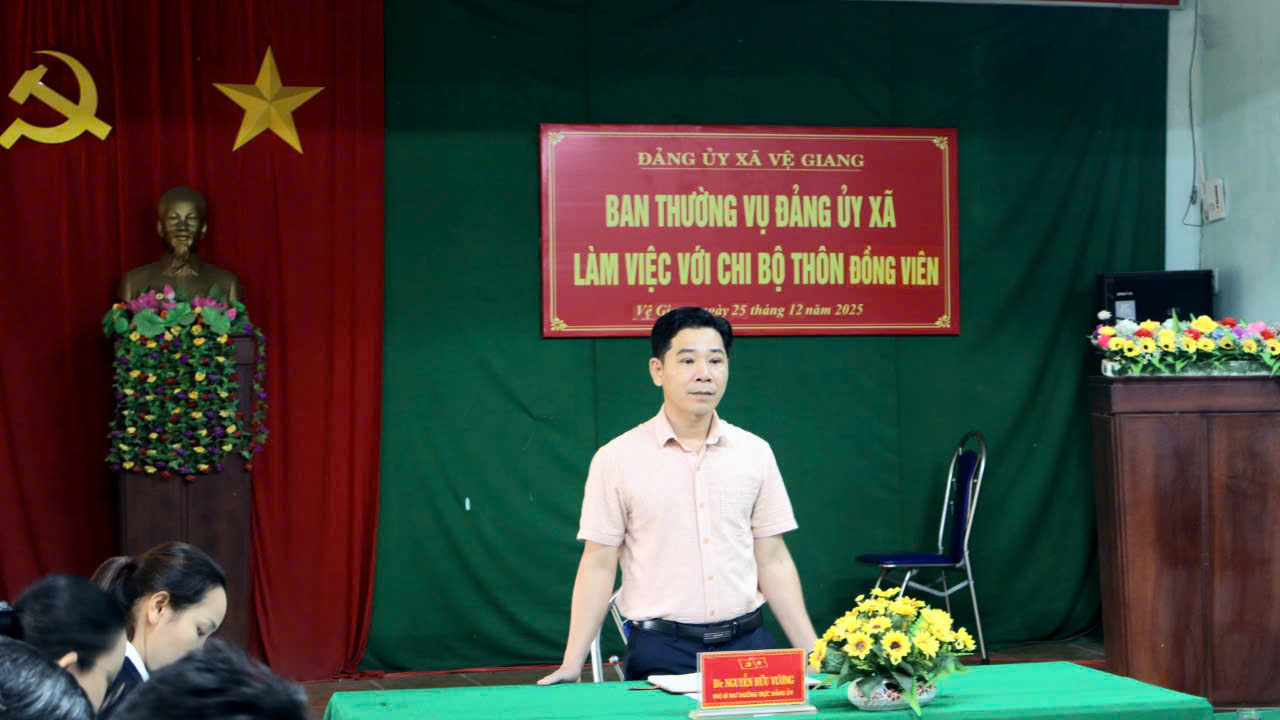 Sáng ngày 25/12/2025, Ban Thường vụ Đảng ủy xã Vệ Giang đã có buổi làm việc với Chi bộ thôn Đồng Viên nhằm nắm tình hình thực hiện nhiệm vụ năm 2025 và định hướng nhiệm vụ thời gian tới. Chủ trì buổi làm việc đồng chí Nguyễn Hữu Vương – Phó Bí thư Thường trực Đảng ủy xã. Dự buổi làm việc còn có đồng chí Lương Văn Linh - Ủy viên BTV Đảng ủy, Phó Chủ tịch HĐND xã cùng đại diện lãnh đạo các cơ quan mưu giúp việc Đảng ủy, lãnh đạo các cơ quan, đơn vị trung tâm thuộc xã và toàn thể đảng viên chi bộ Đồng Viên.
