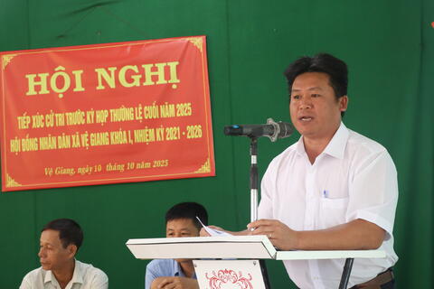 Đêm 31/10 đến sáng ngày 01/11/2025 mưa lớn kéo dài trên địa bàn xã Vệ Giang, Bí Thư Đảng ủy, Chủ tịch HĐND xã Nguyễn Thị Tuyết Hà cùng lãnh đạo UBND xã tiếp tục kiểm tra tình hình PCLB tại các điểm có khả năng bị ngập; đồng thời thăm hỏi, động viên, nhắc nhở bà con Nhân dân khu vực thường xuyên bị ngập chủ động chuẩn bị, lương thực, thực phẩm, thuốc y tế cho người già, trẻ em...