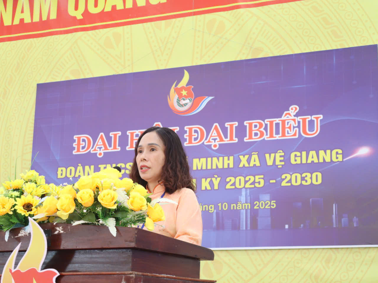 Phát biểu tại Đại hội, đồng chí Nguyễn Thị Tuyết Hà- Bí thư Đảng ủy, Chủ tịch HĐND xã Vệ Giang ghi nhận, biểu dương những kết quả mà tuổi trẻ xã đạt được trong nhiệm kỳ qua; đồng thời đề nghị Đoàn xã tiếp tục phát huy tinh thần đoàn kết, đổi mới, sáng tạo; đẩy mạnh giáo dục lý tưởng cách mạng, đạo đức, lối sống văn hóa; xây dựng đội ngũ cán bộ trẻ có bản lĩnh, năng lực, uy tín; tích cực tham gia chuyển đổi số và xây dựng xã Vệ Giang văn minh, hiện đại.
