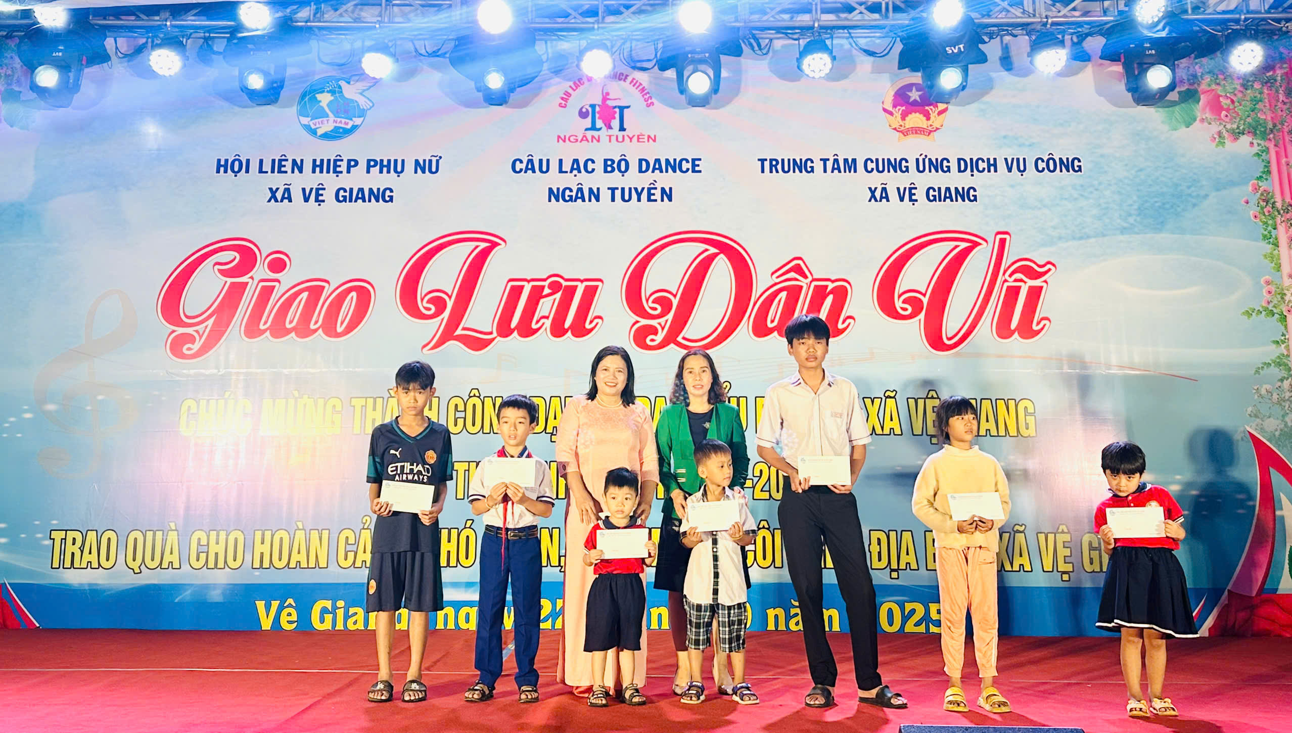 Nhân dịp này, Hội Liên hiệp Phụ nữ xã Vệ Giang đã trao tặng 10 suất quà cho các em thiếu nhi có hoàn cảnh khó khăn, mỗi suất trị giá 300.000 đồng, thể hiện tinh thần tương thân tương ái, góp phần lan tỏa yêu thương trong cộng đồng.