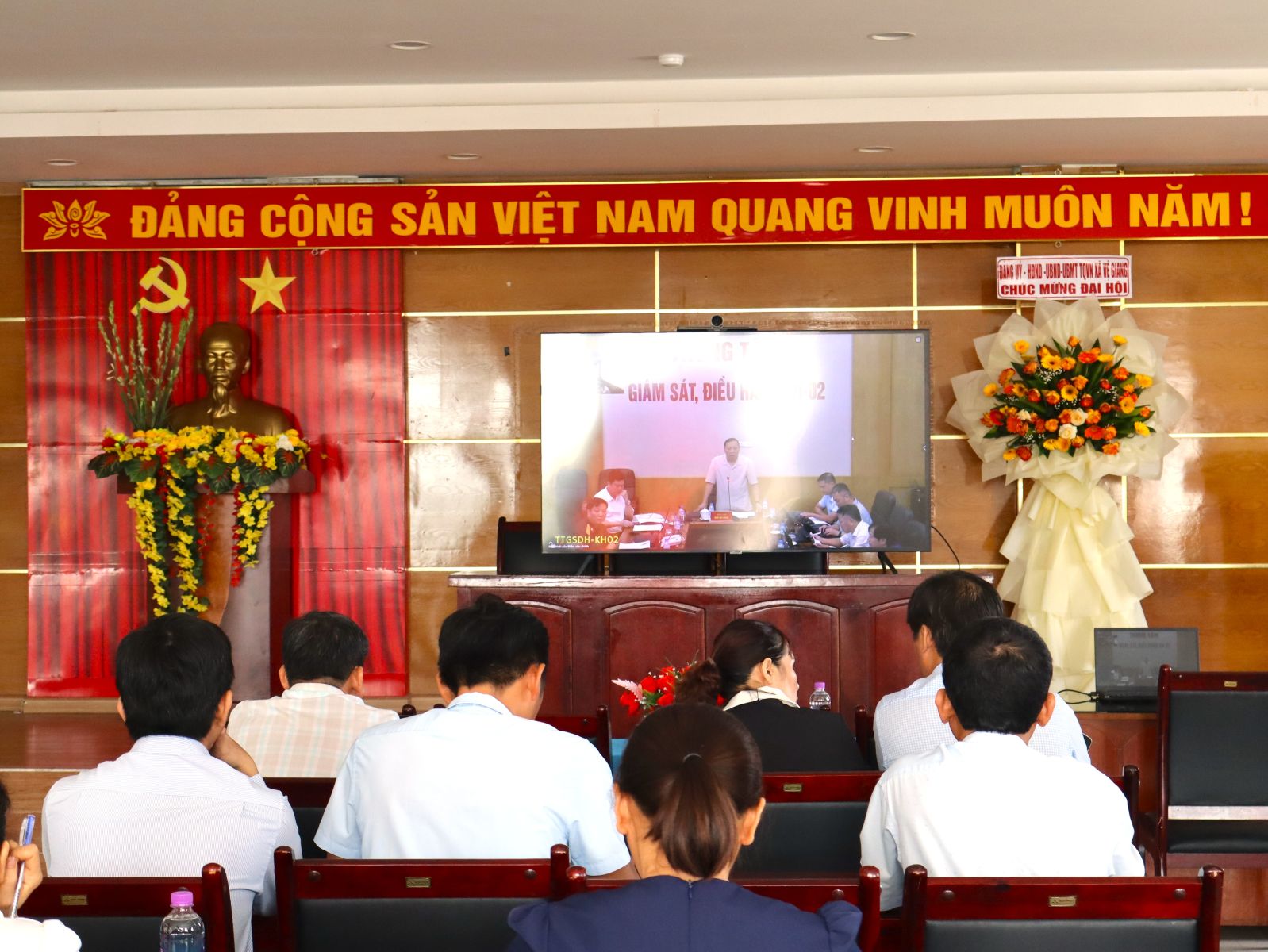 Dự Hội nghị trực tuyến tại điểm cầu xã Vệ Giang có các đồng chí: Nguyễn Thị Tuyết Hà – Bí thư Đảng ủy, Chủ tịch HĐND xã; đồng chí Đoàn Việt Vân – Phó Bí thư, Chủ tịch UBND xã; lãnh đạo Ban Xây dựng Đảng; các phòng ban chuyên môn của xã.