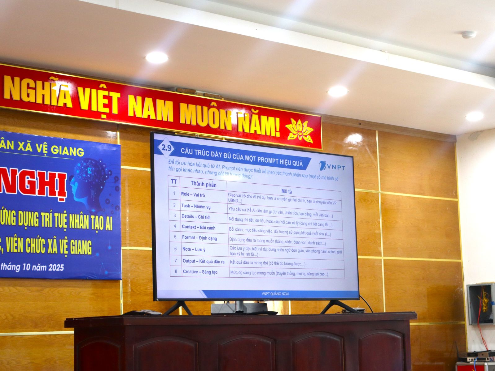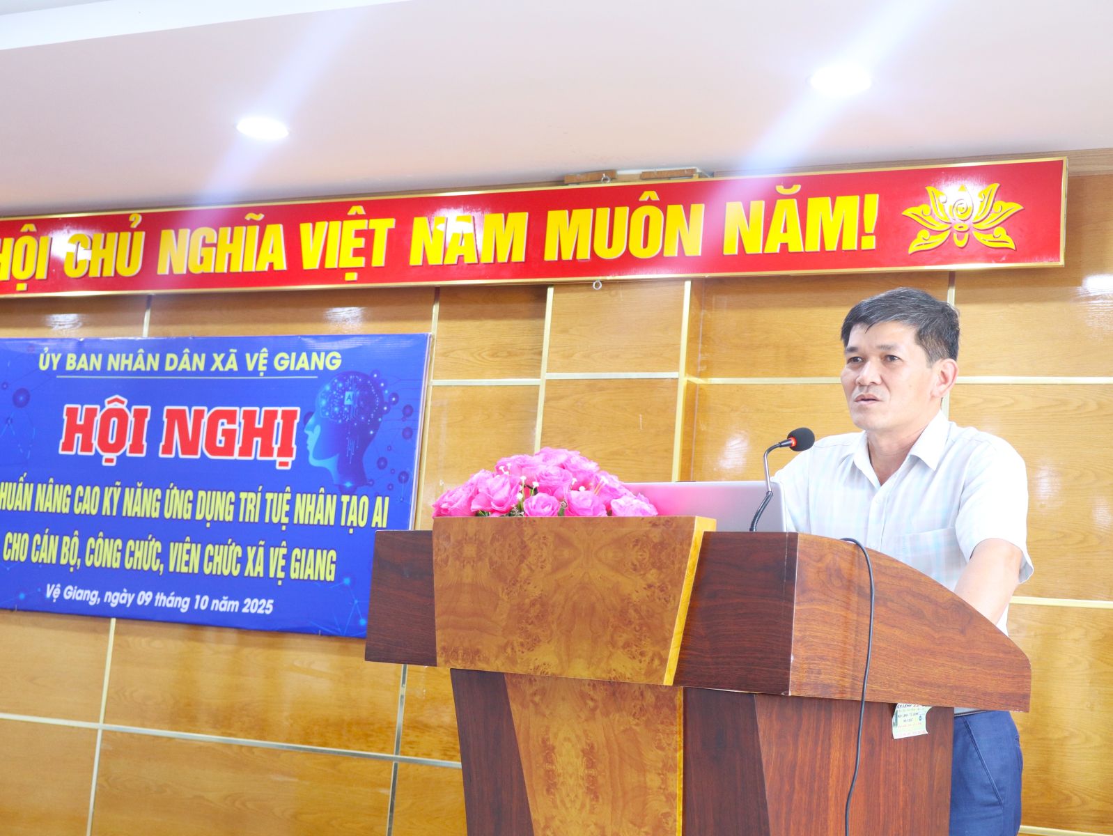 Thực hiện Kế hoạch số 46/KH-UBND ngày 01/10/2025, chiều ngày 09/10/2025, tại Hội trường UBND xã Vệ Giang, UBND xã đã phối hợp với VNPT Quảng Ngãi tổ chức lớp tập huấn kiến thức, kỹ năng ứng dụng trí tuệ nhân tạo (AI) cho toàn thể cán bộ, công chức, viên chức trên địa bàn xã.