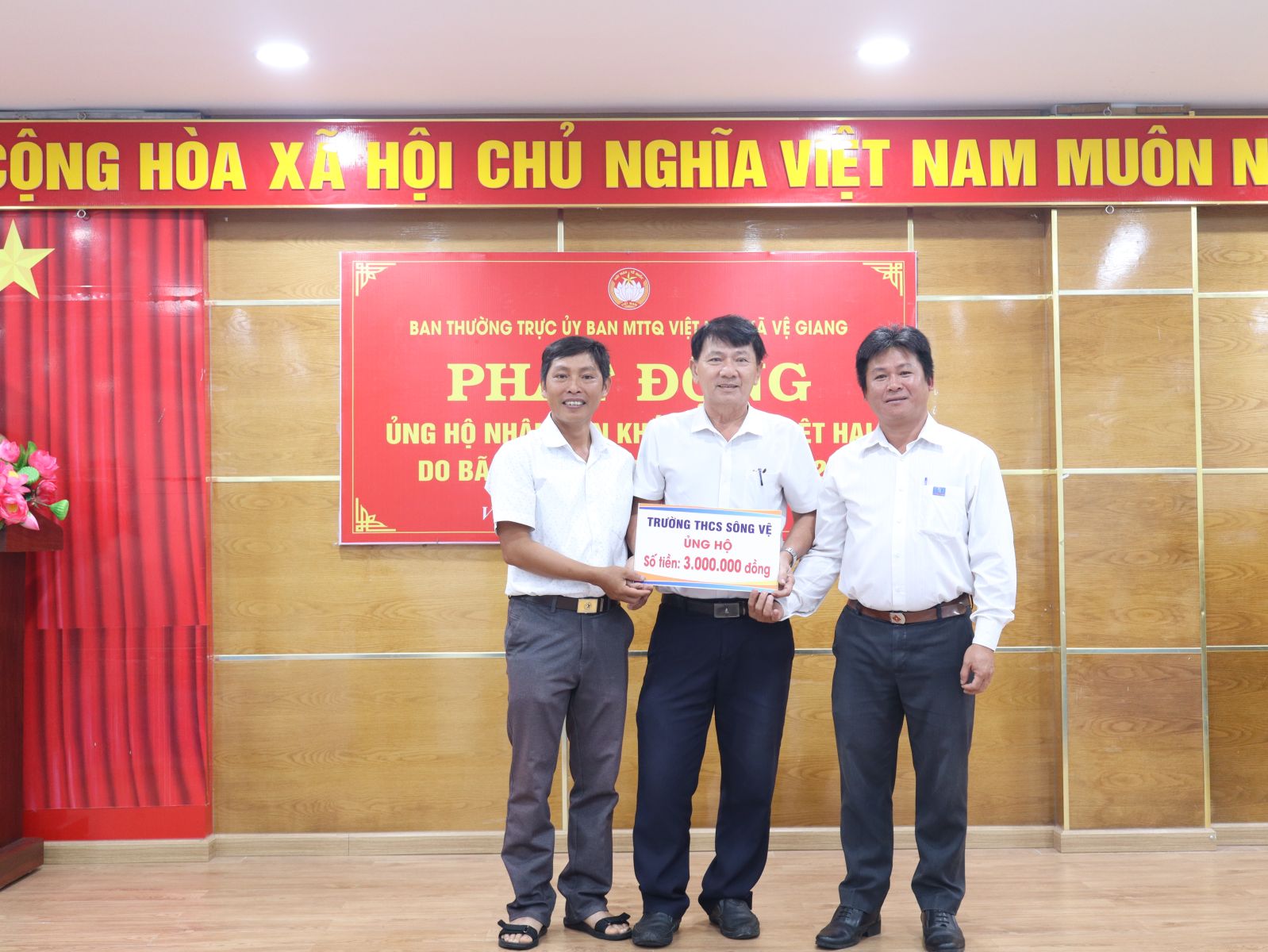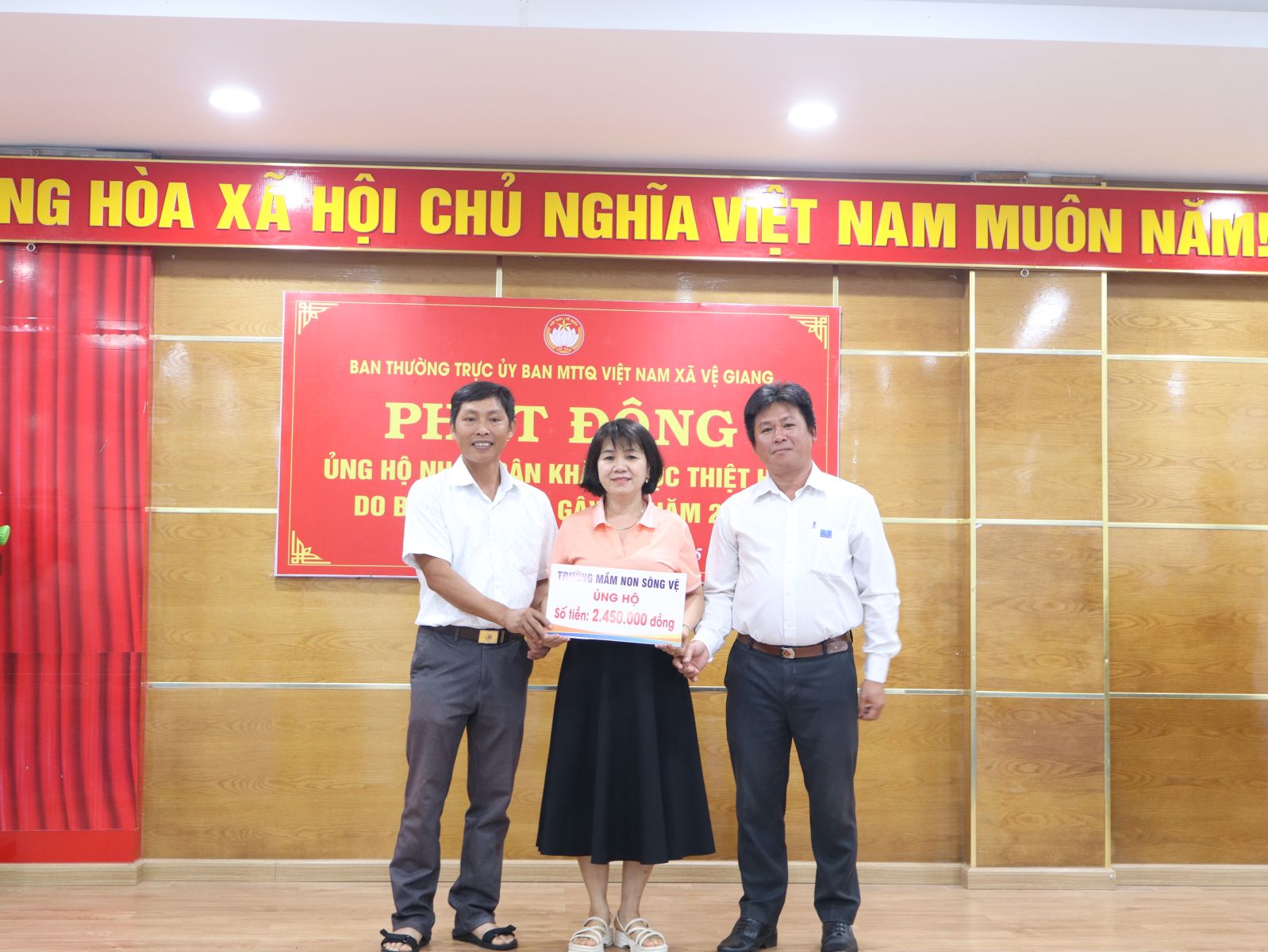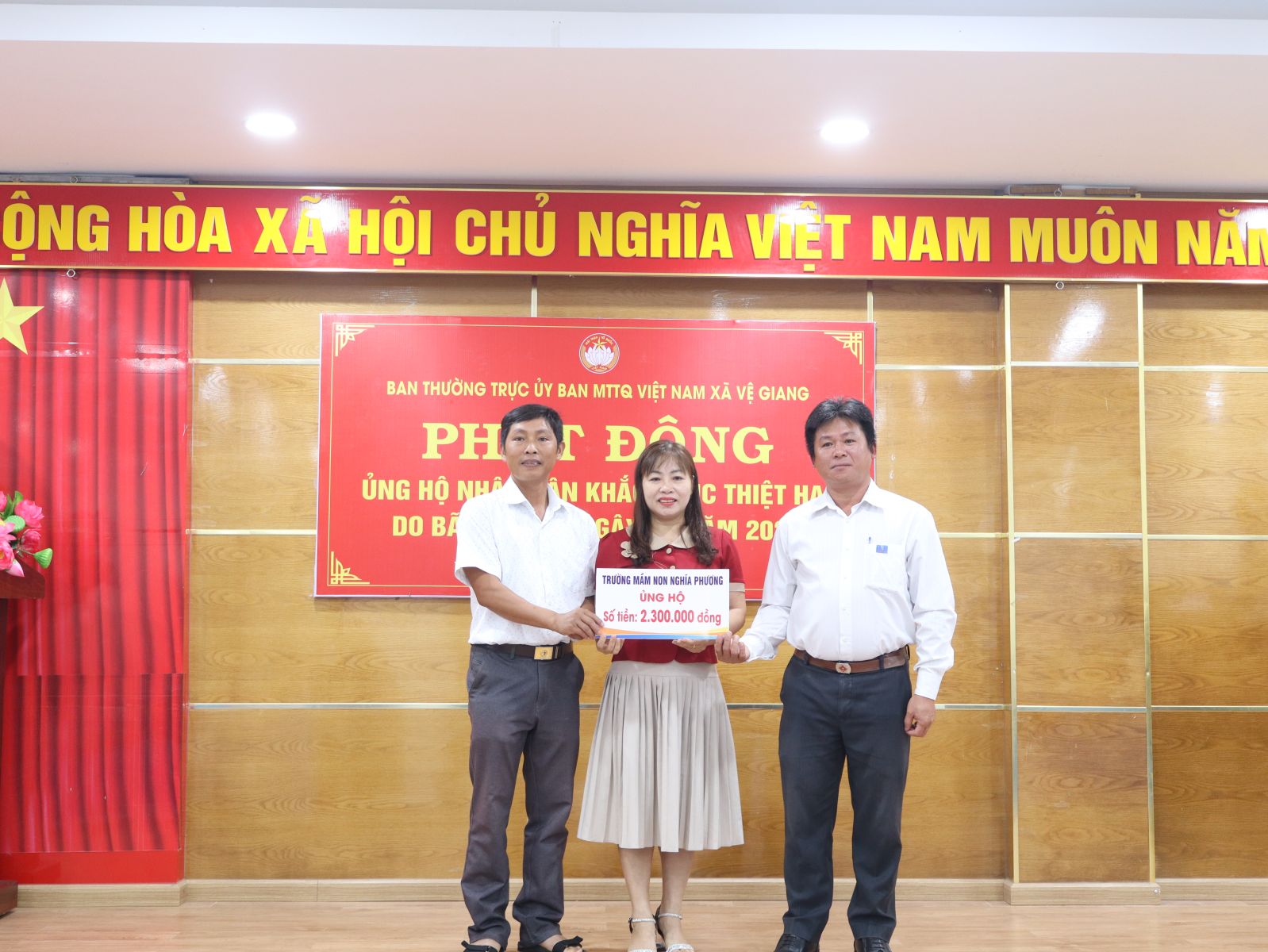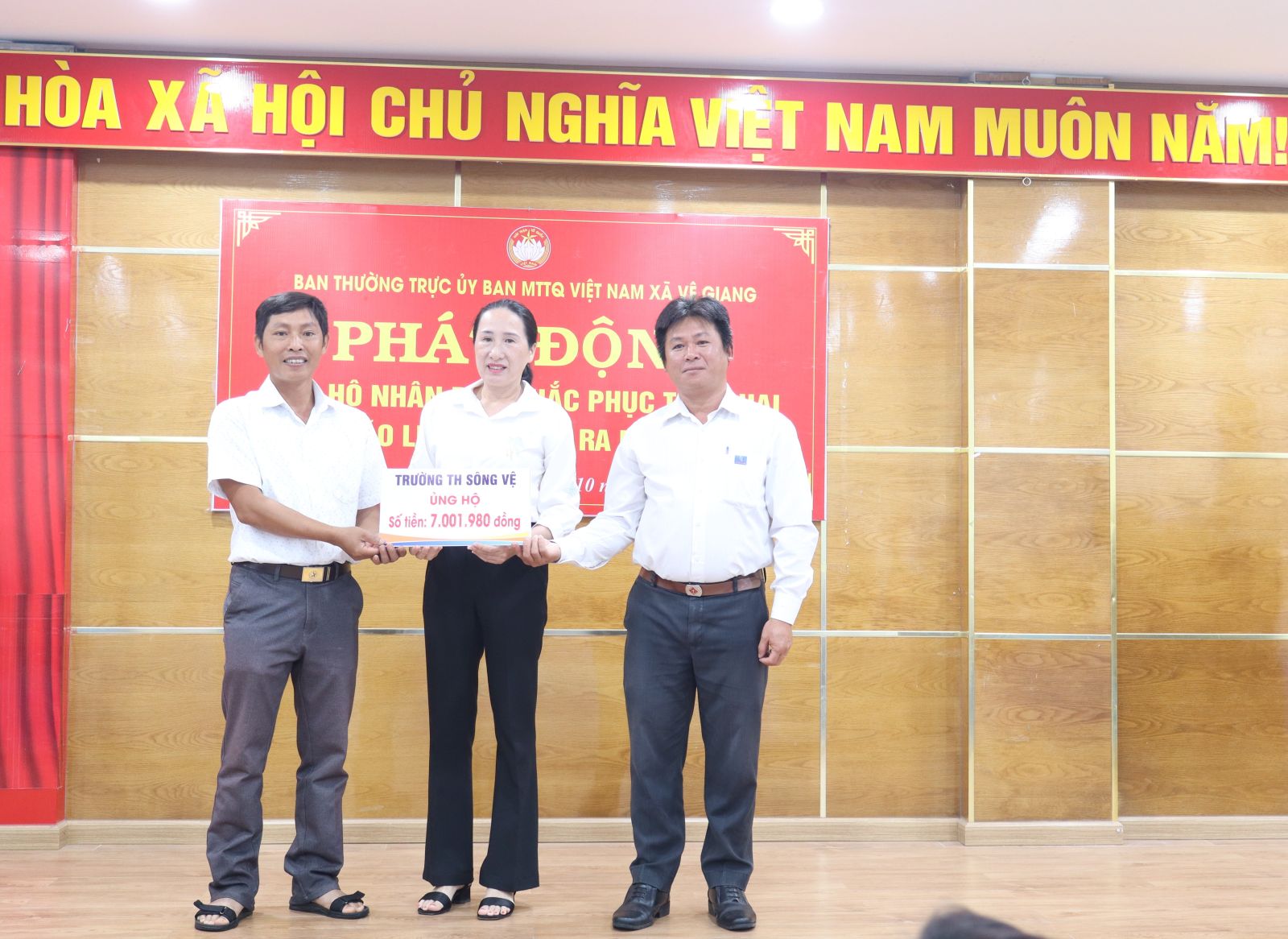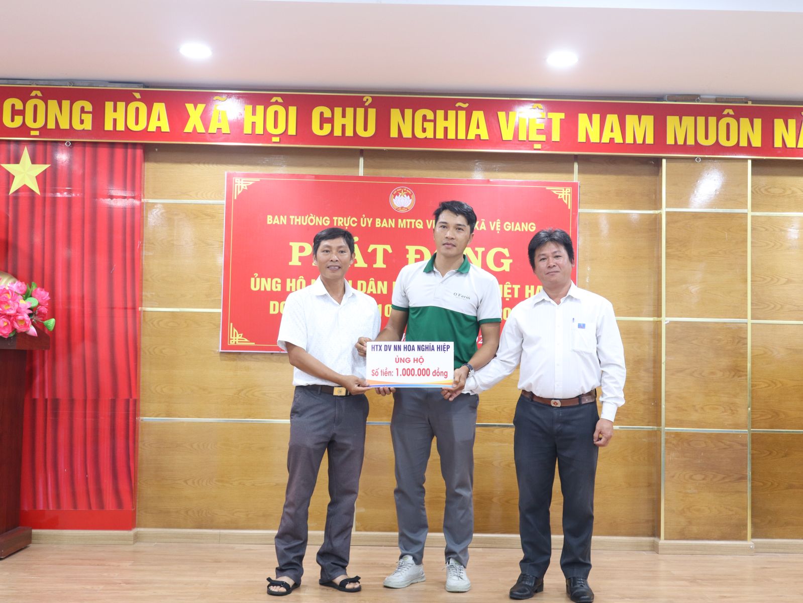 Tại buổi lễ, đại diện các cơ quan, đơn vị, đoàn thể và cá nhân đã quyên góp, ủng hộ bằng tiền mặt nhằm kịp thời chia sẻ khó khăn, giúp đồng bào vùng bị bão sớm ổn định cuộc sống. Số tiền ủng hộ sẽ được Ban Vận động cứu trợ xã Vệ Giang – Ủy ban MTTQVN xã cập nhật tổng hợp công khai và chuyển đến Ủy ban Mặt trận Tổ quốc Việt Nam tỉnh Quảng Ngãi để kịp thời hỗ trợ đồng bào vùng bị thiệt hại.