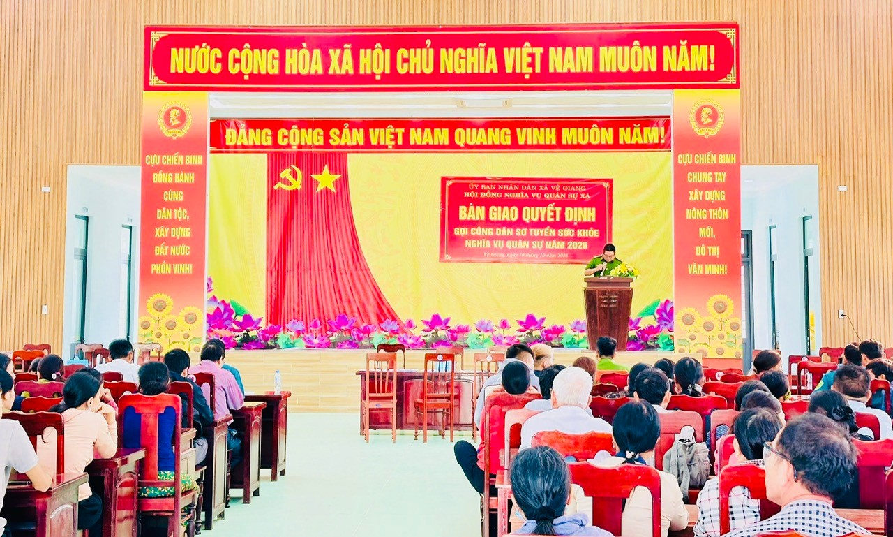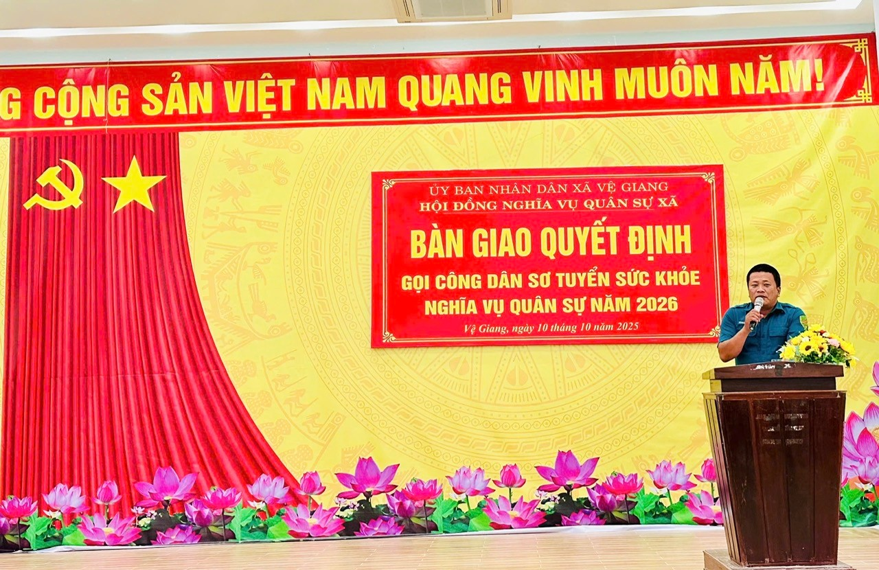 Việc bàn giao quyết định gọi công dân sơ tuyển sức khỏe nghĩa vụ quân sự năm 2026 là một trong những bước quan trọng, góp phần thực hiện chỉ tiêu tuyển quân của xã Vệ Giang, bảo đảm đúng quy trình, công khai, minh bạch và đạt chất lượng.