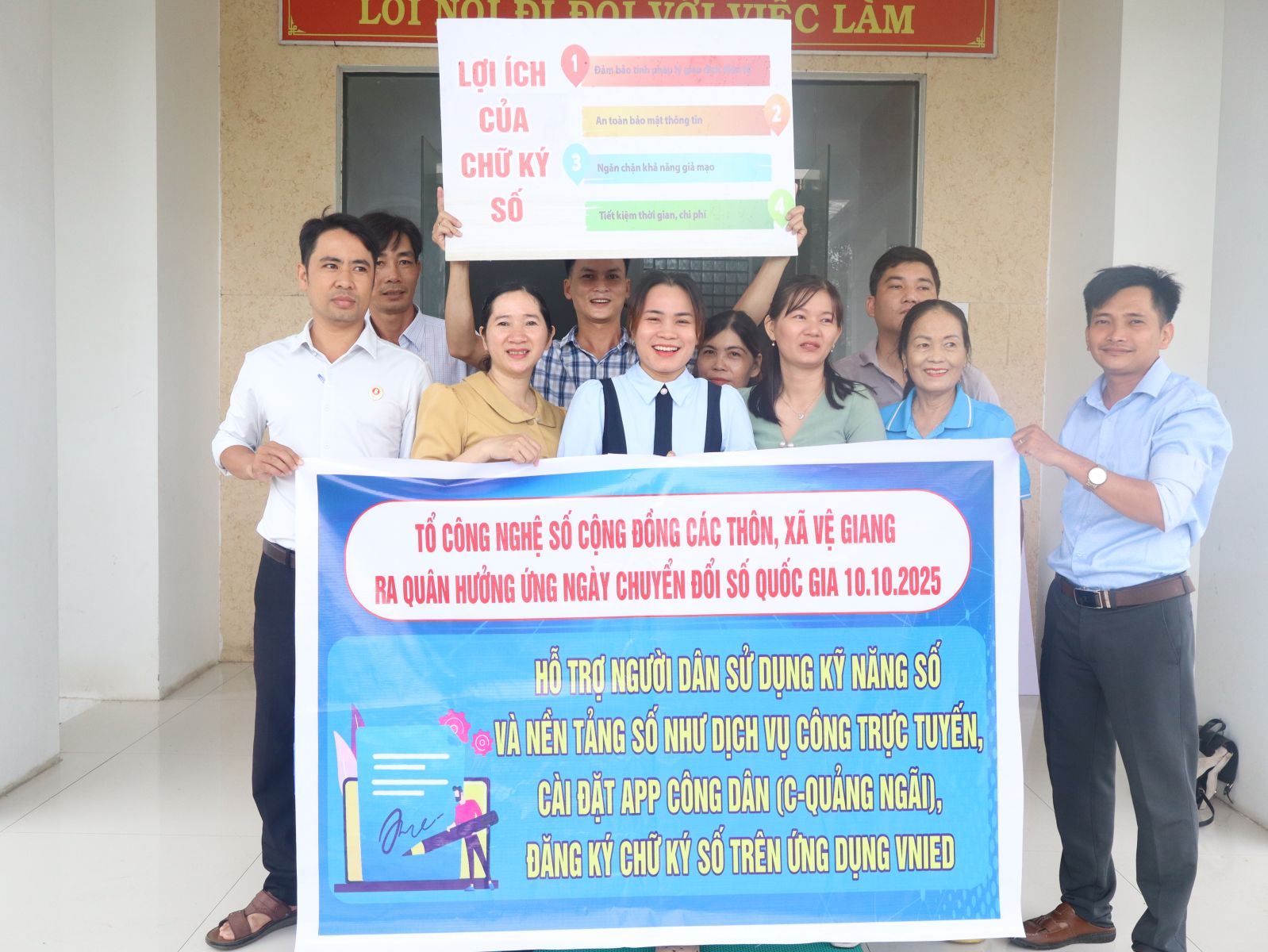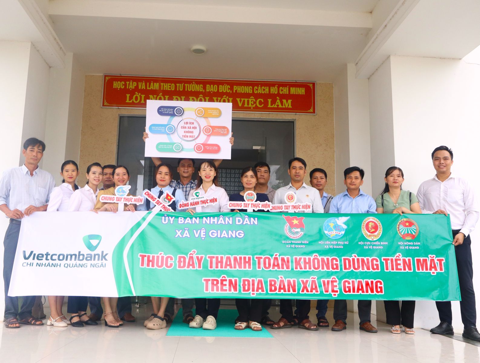 Thực hiện Công văn số 2527/UBND-KTTH ngày 16/9/2025 của UBND tỉnh Quảng Ngãi về việc triển khai Công điện số 124/CĐ-TTg ngày 30/7/2025 của Thủ tướng Chính phủ về thúc đẩy thanh toán không dùng tiền mặt, UBND xã Vệ Giang đã ban hành Kế hoạch số 47/KH-UBND ngày 06/10/2025 và tổ chức lễ ra quân tuyên truyền vào sáng ngày 09/10/2025.
